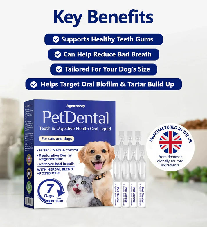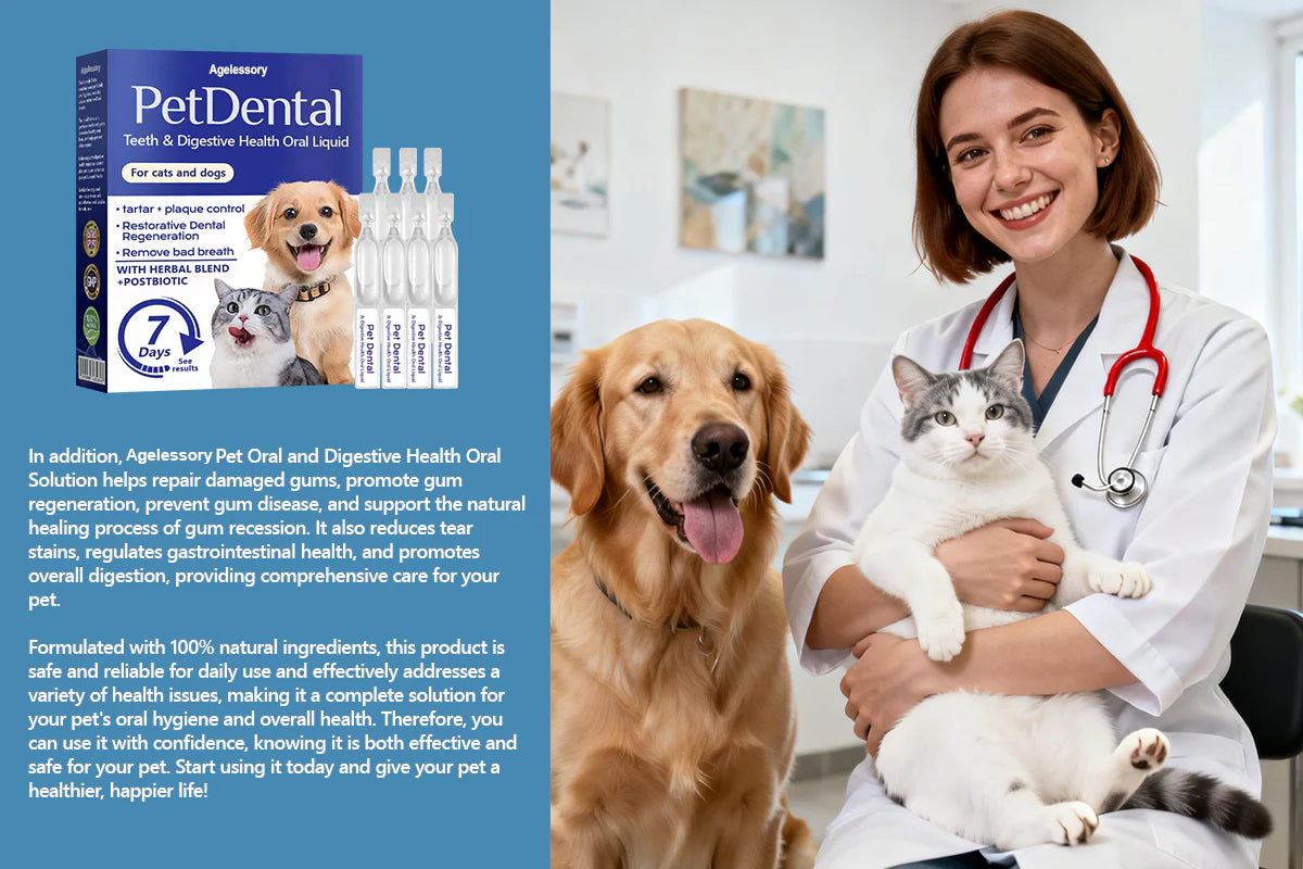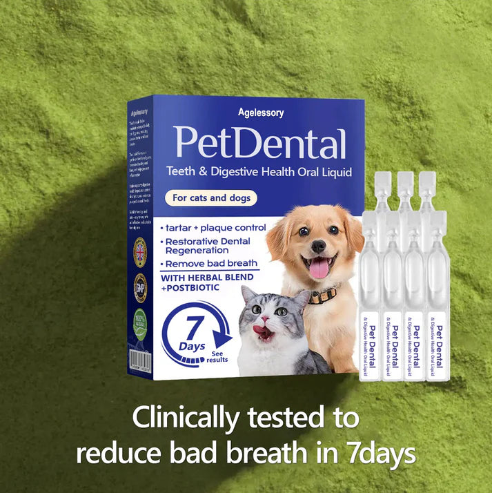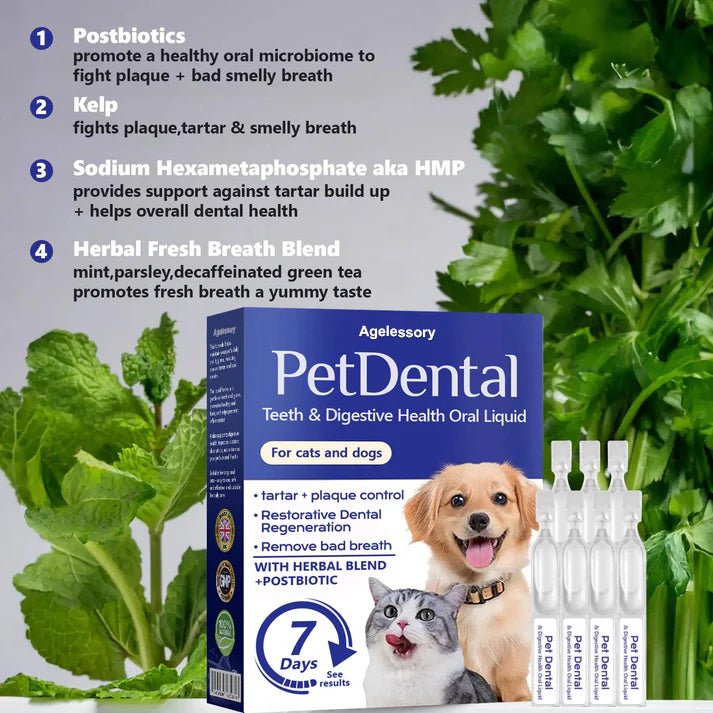Agelessoryยฎ Oral Liquid for Pet Dental and Digestive Health eliminates 99.99% of bacteria, combats bad breath, removes plaque and tartar, treats gingivitis, and supports your pet's dental health. This oral liquid contains natural ingredients that gently but effectively clean your pet's teeth and promote gum health.