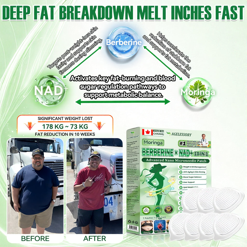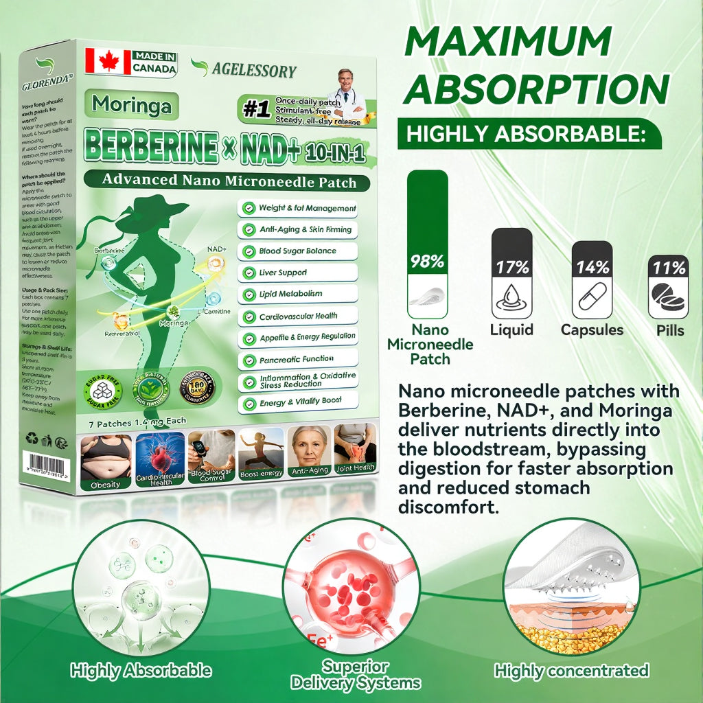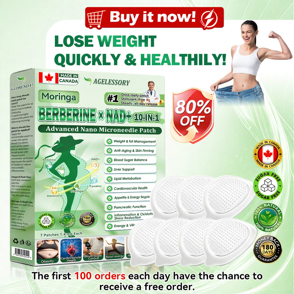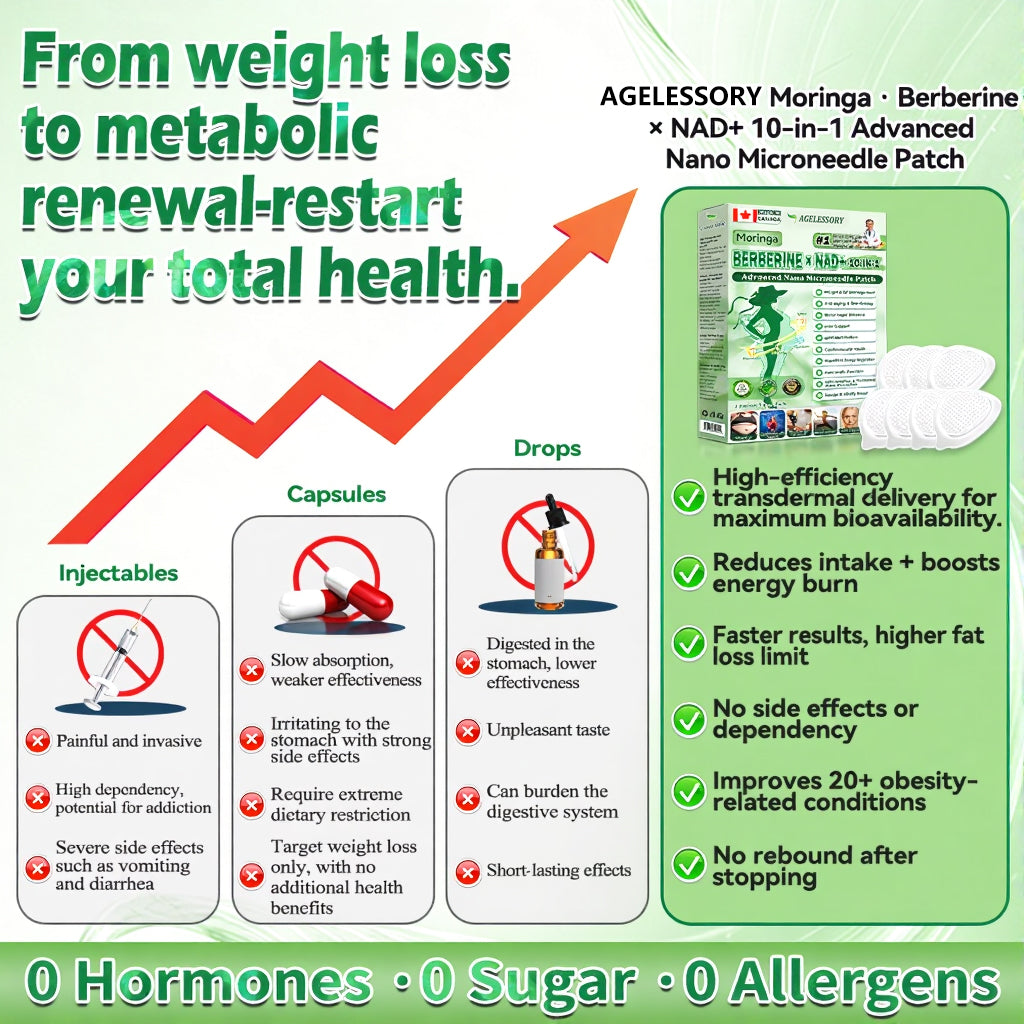 ✅ AGELESSORY® 𝙈𝒐𝒓𝒊𝒏𝒈𝗮 · 𝗕𝗲𝗿𝗯𝐞𝐫𝐢𝐧𝙚 × 𝙉𝑨𝑫+ 𝟏𝟎-𝙞𝙣-1 𝘼𝒅𝒗𝒂𝒏𝒄𝒆𝐝 𝐍𝐚𝐧𝙤 𝙈𝙞𝙘𝙧𝙤𝙣𝒆𝒆𝒅𝒍𝐞 𝐏𝐚𝐭𝙘𝙝 breaking away from the burden of traditional injectable or oral weight-loss products, this advanced nano microneedle transdermal delivery system gently and steadily releases active ingredients for up to 8 hours. Core ingredients Moringa and Berberine work synergistically to support appetite management and lipid metabolism, making fat loss feel more natural and effortless—without extreme dieting or physical strain. At the same time, NAD⁺ supports cellular energy levels and skin firmness, helping maintain a healthy, well-toned appearance during body-weight changes. The overall formula is gentle and stable, offering a more comfortable experience for those seeking an effective, non-irritating, and non-injectable approach to weight management.