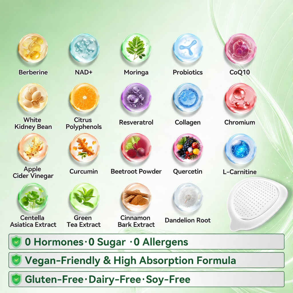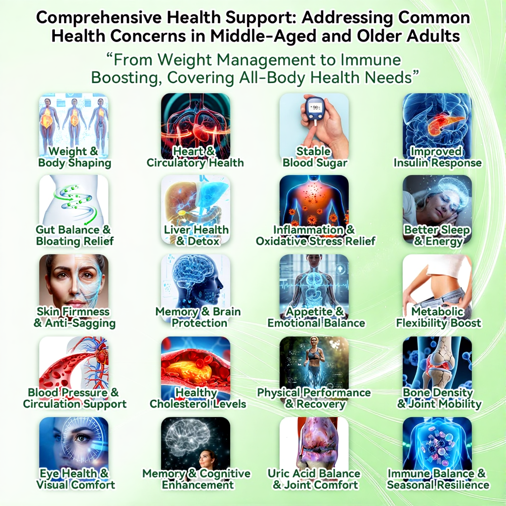 Benefits: Supports effective weight reduction and appetite regulation, stabilizes blood glucose levels, promotes cardiovascular health, reduces chronic low-grade inflammation, and helps alleviate metabolism-related fatigue.
